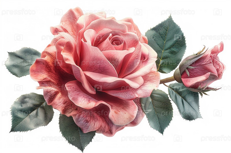 Клипарт, розовая роза с зелеными листьями крупным планом