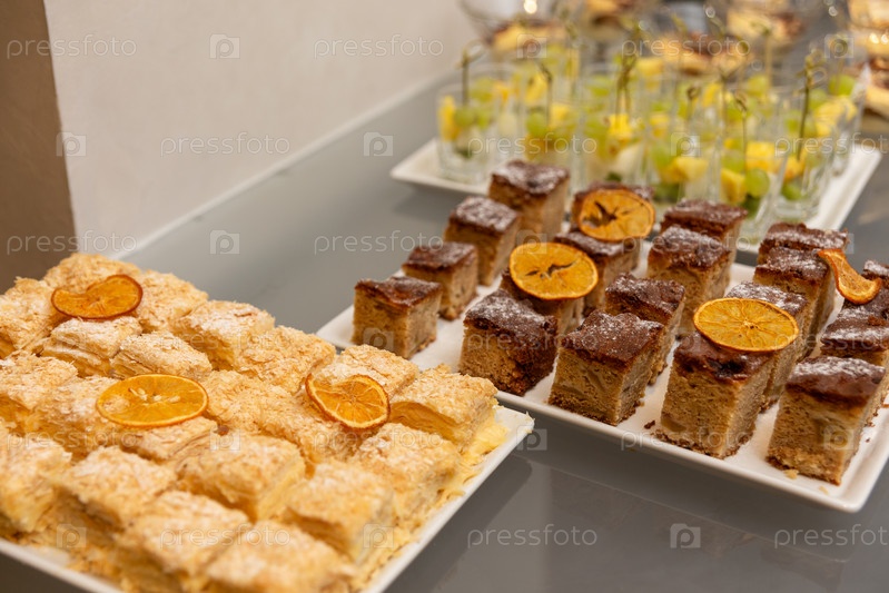 Разные виды десерта на банкете, посвященном свадьбе, дню рождения или другой праздничной дате