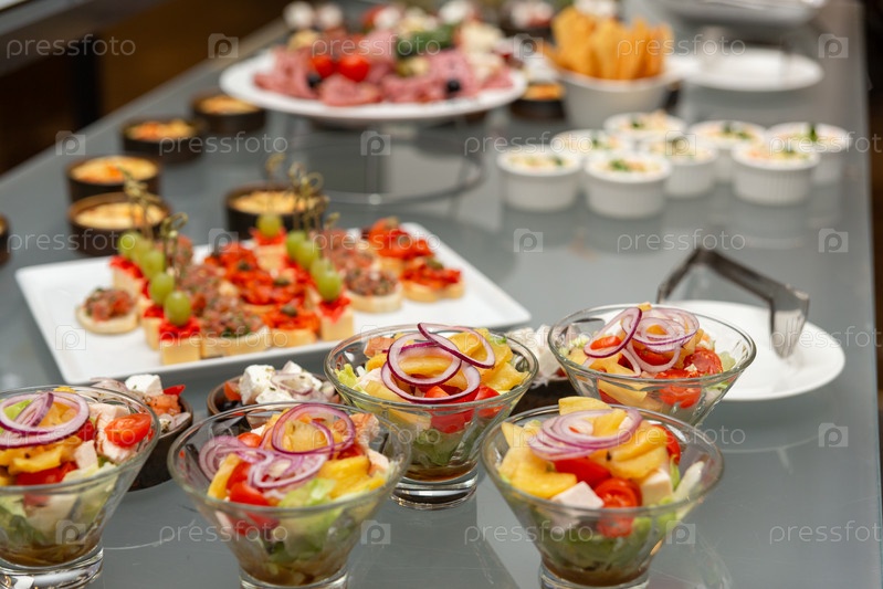Фуршетный стол с холодными закусками и салатами. Шведский стол, фуршет в ресторане, мини-канапе, закуски и закуски