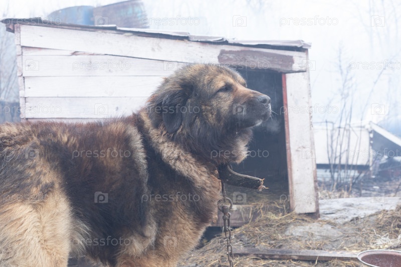 Большая пушистая коричневая собака на цепи на фоне старой будки