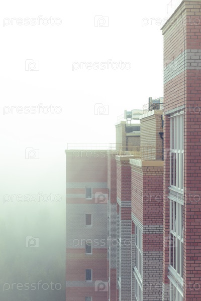 Розовый кирпичный панельный дом в тумане / Pink brick panel house in the fog