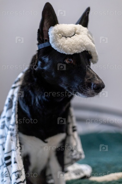 Черная домашняя собака в милой белой маске для сна / A black pet dog wearing a cute white sleeping mask