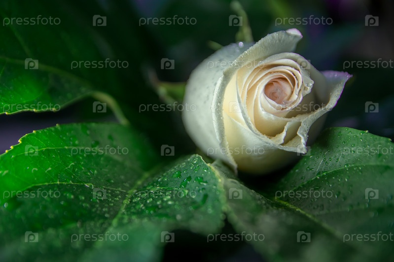 Один бутон белой розы лежит на большом зеленом листе