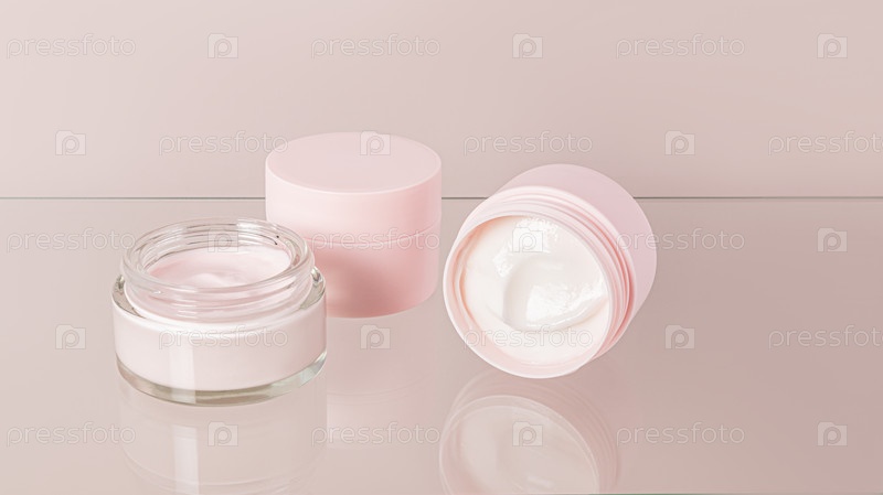 Нежная текстура белого и розового косметического крема для ухода за кожей лица и тела в двух банках на стеклянном фоне с отражением. макет