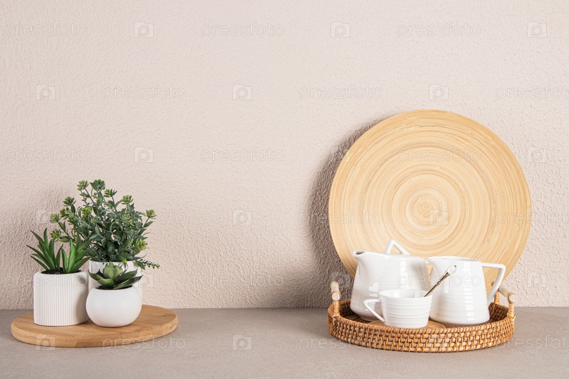 Набор керамической посуды для чаепития на плетеном подносе и комнатные растения в горшках на каменной столешнице современной кухни. минимализм