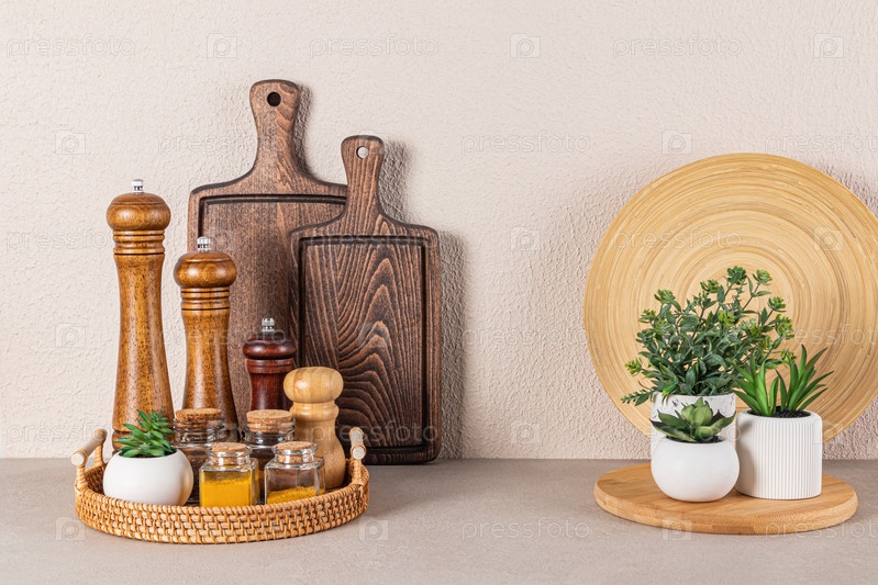 Набор деревянных мельниц для специй и стеклянных банок со специями на круглом плетеном подносе на каменной столешнице в интерьере современного кухонного пространства