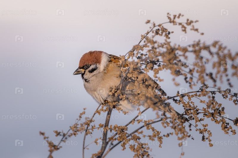 Воробей зимой ест семена полыни