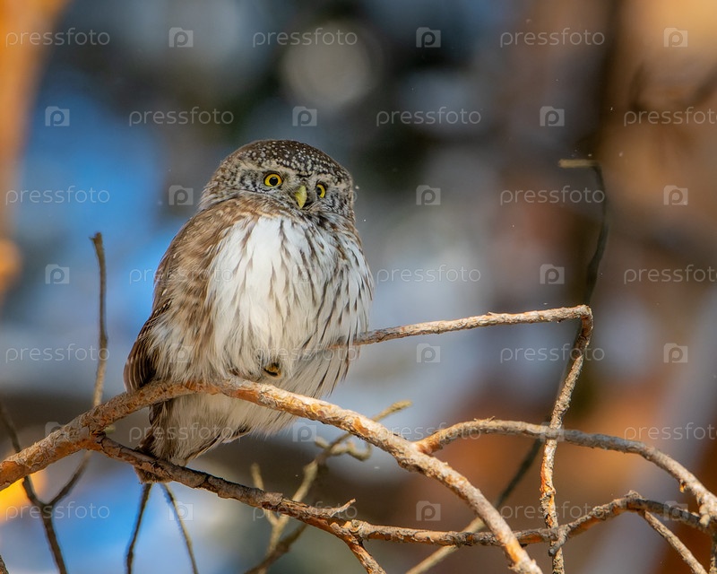 Маленькая сова воробьиный сыч сидит на ветке в лесу