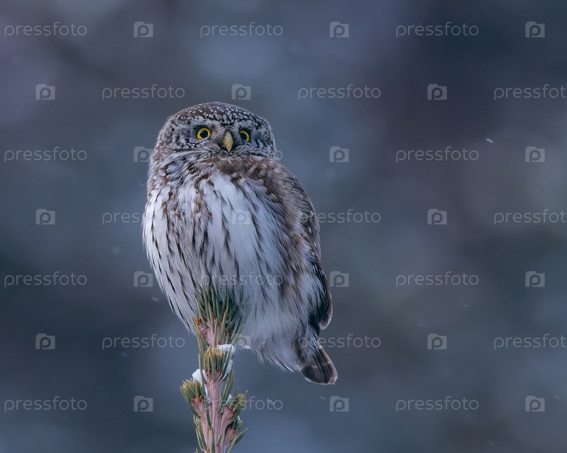 Маленькая сова воробьиный сыч сидит на верхушке ели зимним вечером