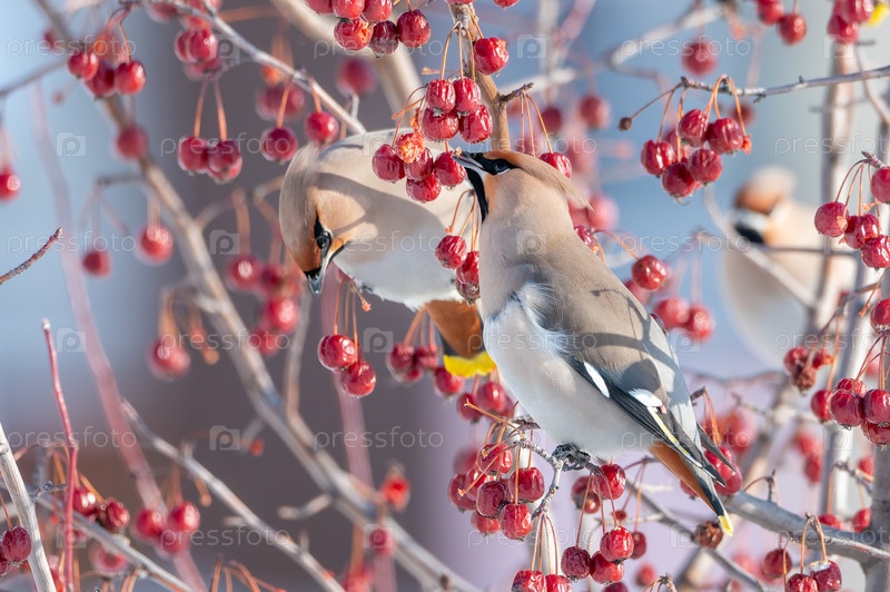 Пара свиристелей едят ягоды на ветках боярышника