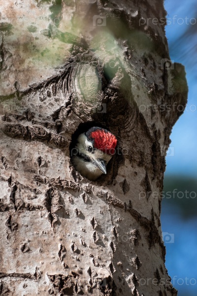 Птенец большого пестрого дятла выглядывает из дупла