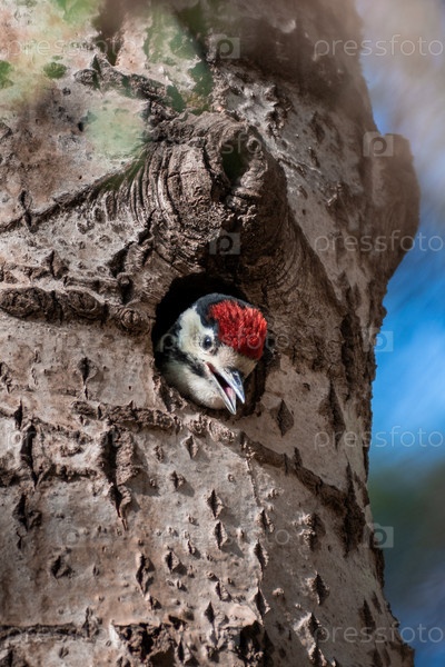 Птенец большого пестрого дятла выглядывает из дупла