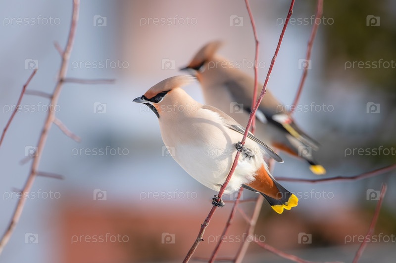 Пара птиц свиристелей на ветках боярышника