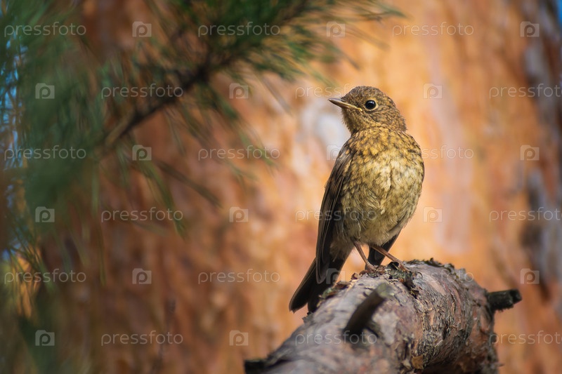 Молодая птичка зарянка малиновка на ветке в лесу