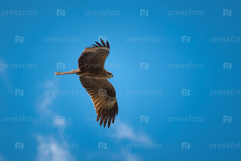 Черный коршун летит на фоне голубого неба