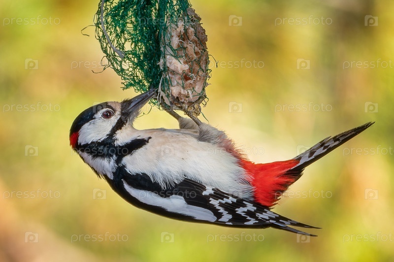 Большой пестрый дятел клюет сало зимой в лесу