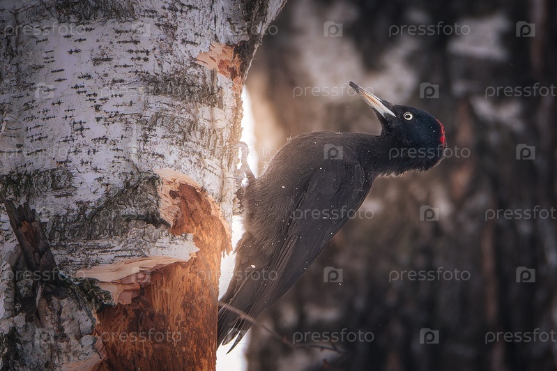 Черный дятел желна долбит дерево