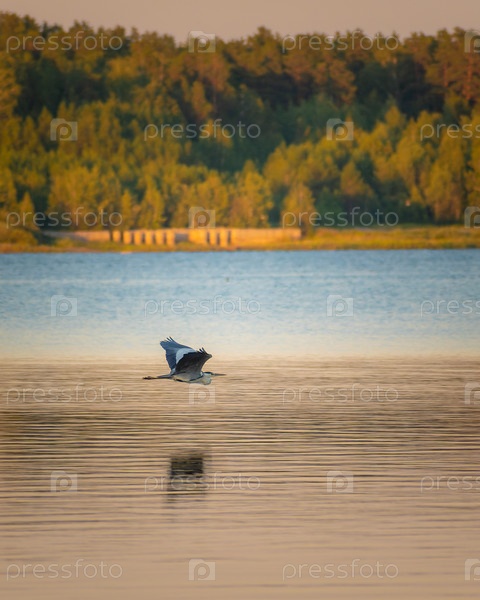 Серая цапля летит низко над водой на закате