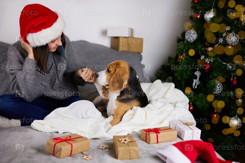 Девушка в шапке Санта-Клауса играет на кровати со своей собакой-биглем