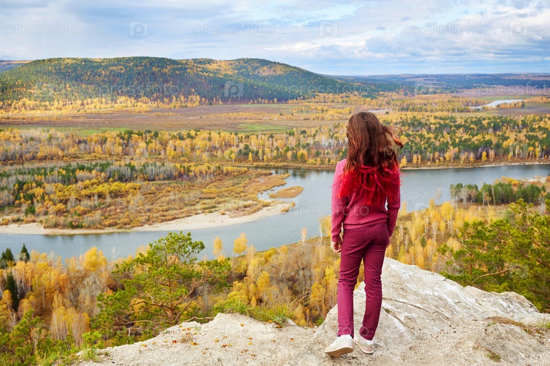 Девушка стоит на скале и смотрит на красивый осенний пейзаж