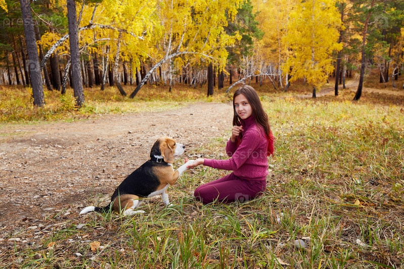 Девушка дрессирует собаку породы бигль в осеннем лесу