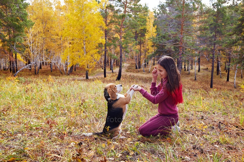 Девушка играет с собакой-биглем в осеннем лесу