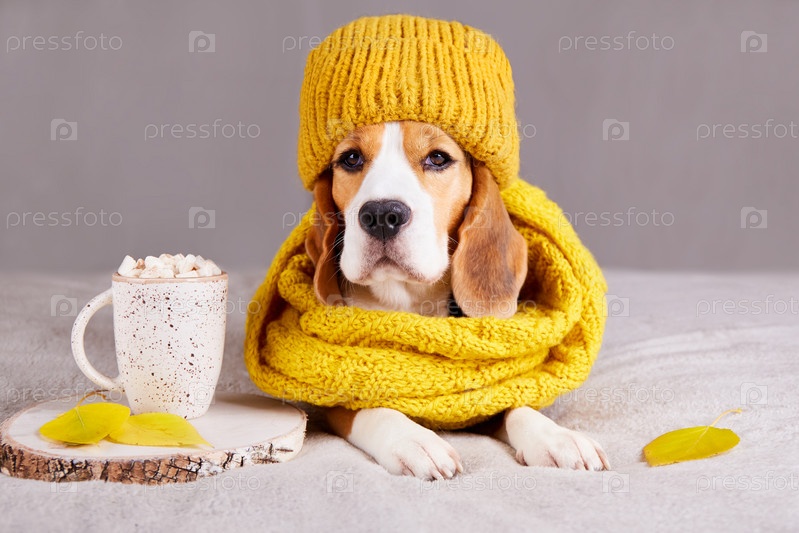 На диване лежит собака-бигль в вязаной шапке и шарфе