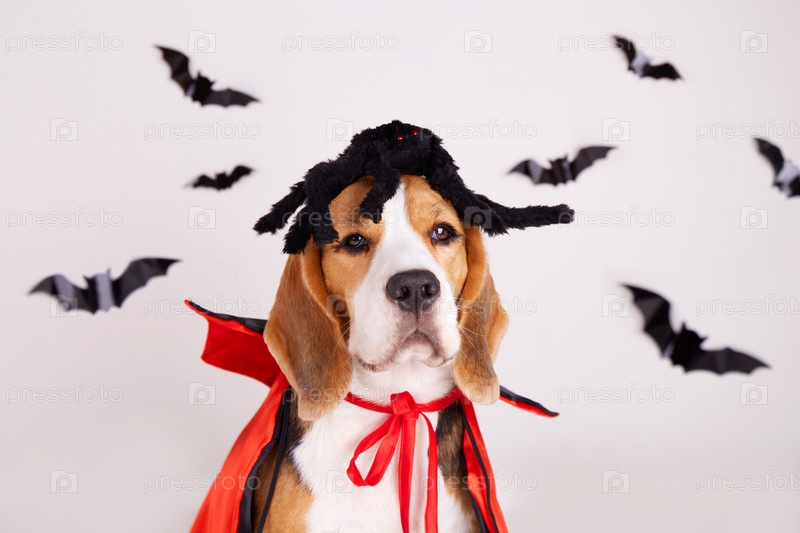 Собака-бигль с пауком на голове и в дьявольской накидке