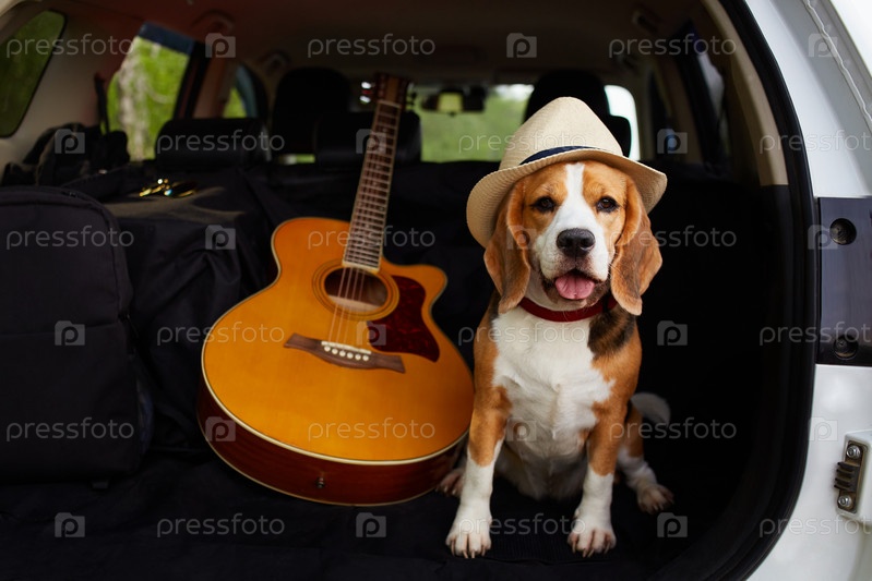 Милая собака породы бигль в соломенной шляпе сидит в багажнике машины