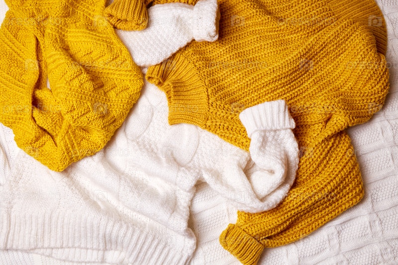 На кровати разбросана куча вязаных белых и оранжевых свитеров