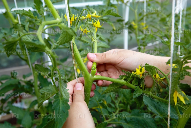 Руки женщины формируют кусты цветущих томатов, обрезают боковые побеги