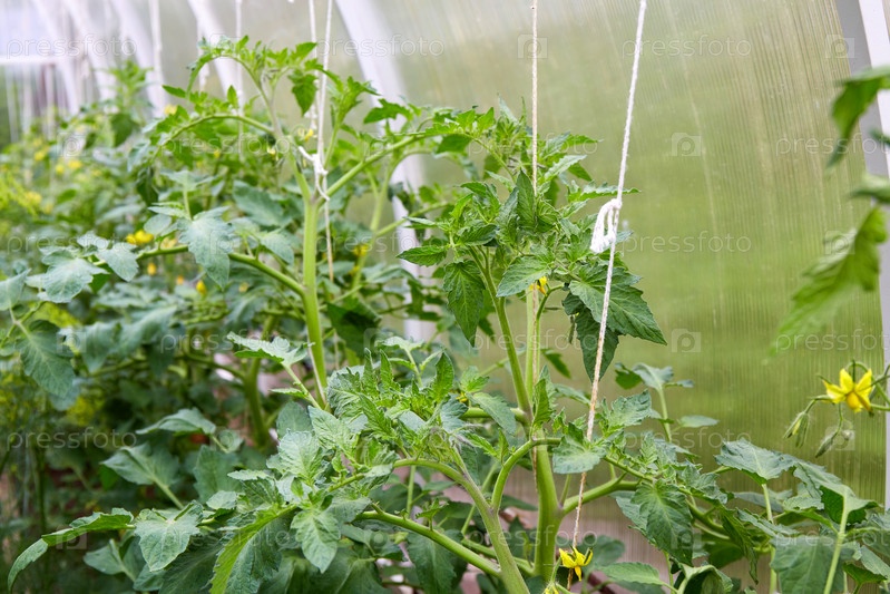 Молодые цветущие растения томатов растут в теплице