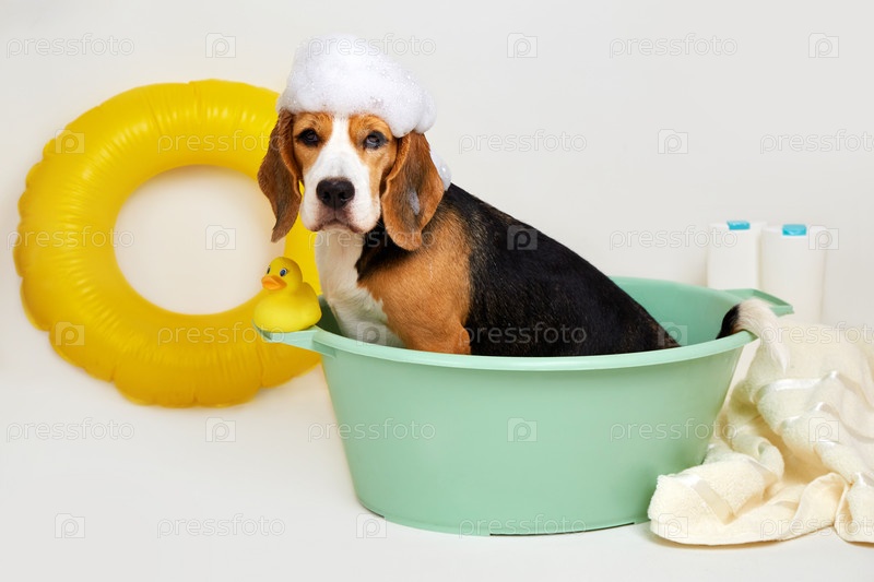 Собака породы бигль с мыльной пеной на голове во время купания в тазике