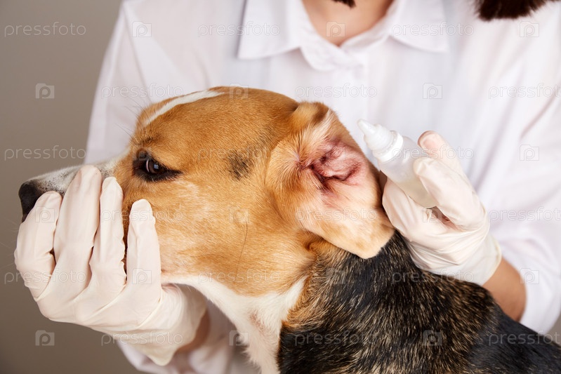 Ветеринар закапывает капли в уши собаки породы бигль