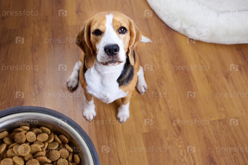 Собака породы бигль сидит на полу и смотрит на миску с сухим кормом