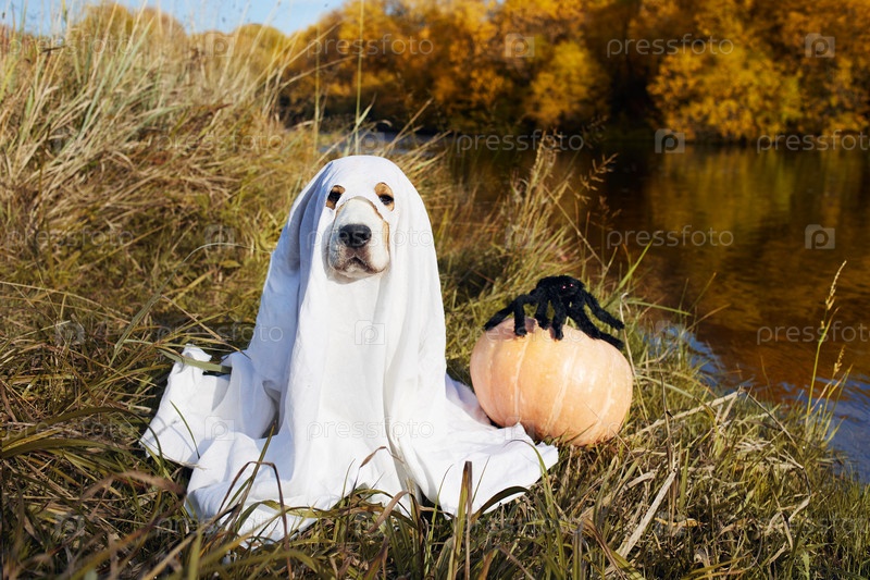 Открытка на Хэллоуин с домашним животным. Сидит собака-бигль в костюме призрака