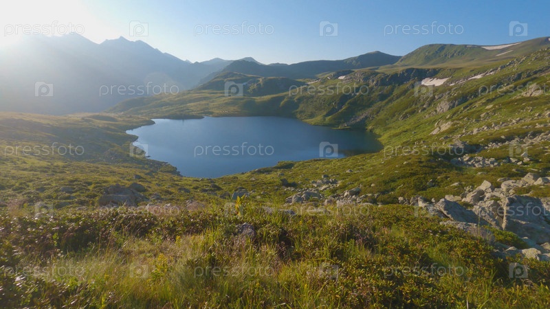 Красивое голубое озеро в горах среди камней и травы. Рассвет в горах. Поход в горы летом