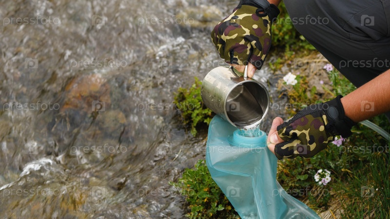 Путешественник черпает воду из горного ручья металлической кружкой. Наливаем воду в разборный мягкий бак. Крупный план мужской руки в перчатке, наполняющей резервуар водой из ручья