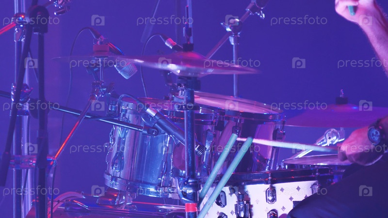Динамичный снимок рок-концерта с акцентом на барабанную установку на сцене. Сцена рок-концерта