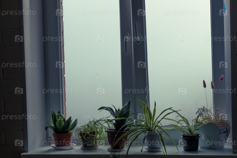 Шесть растений в горшках стоят на подоконнике, на фоне густого белого тумана / Six potted plants stand on the windowsill, against a background of thick white fog