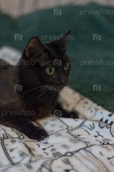 Черная кошка с большими зелеными глазами играет на мягком белом одеяле