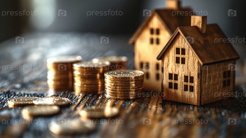 На деревянном столе стопки монет, а рядом две модели деревянных домов