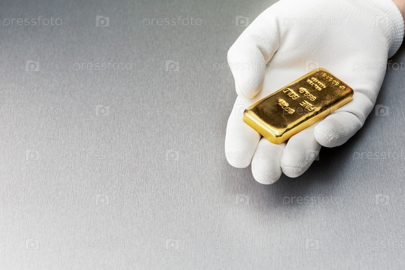 Бизнесмен держит золотой слиток на столе серого цвета со свободным местом