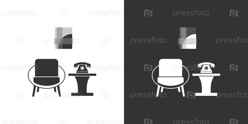 Иконка мебельного интерьера с креслом и ретро телефоном. Черная и белая