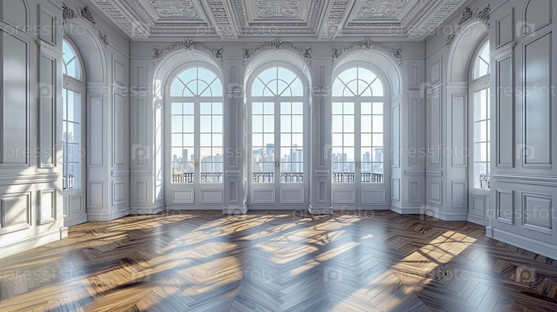 Большая пустая светлая комната с огромными окнами, паркетный пол, залитый лучами солнца