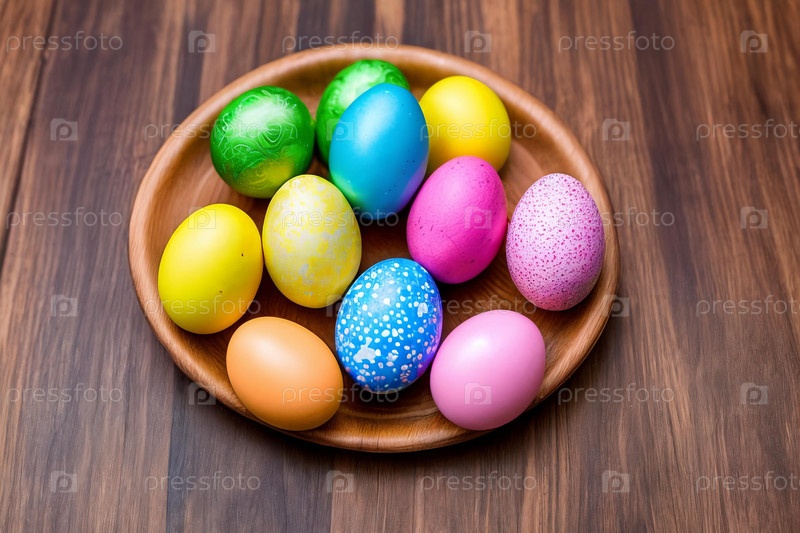 Яркие пасхальные яйца. Крупный план красочных и замысловато украшенных пасхальных яиц, расположенных красивым узором на деревенском деревянном фоне, подчеркивая уникальный дизайн и текстуру