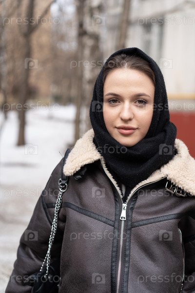 Портрет молодой красивой женщины на улице в платке