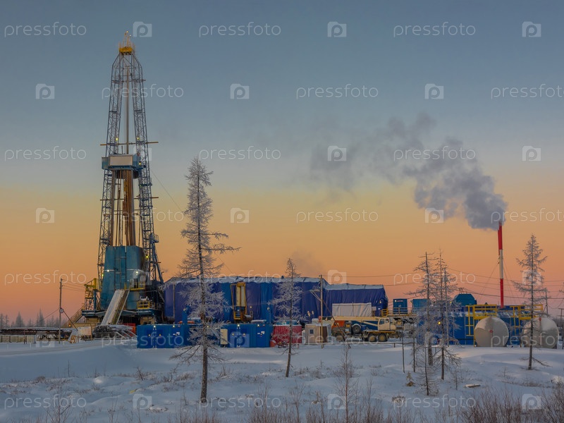 Бурение нефтяных и газовых скважин на северном месторождении. Полярный морозный день. Зимний лесотундровый пейзаж в снегу с буровой установкой. Красивое небо