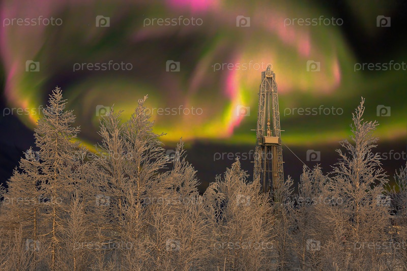 Полярная ночь. Зимний пейзаж с буровой установкой на северном месторождении нефти и газа. На заднем плане красивое небо с северным сиянием