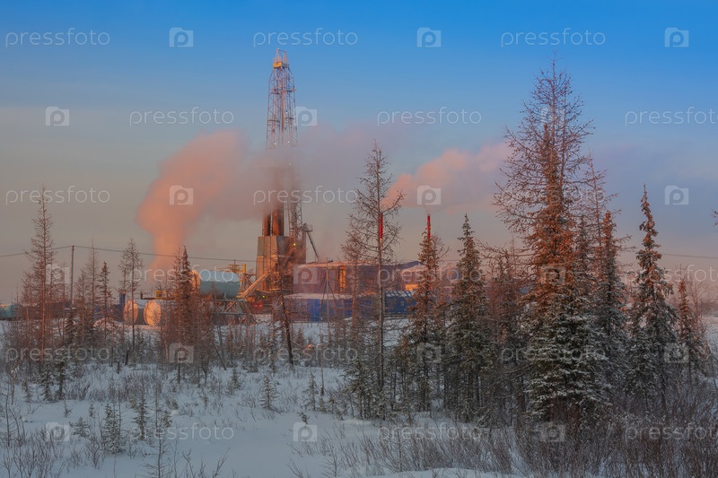 Буровая установка для бурения нефтяных и газовых скважин в северном ландшафте лесотундры. Восходящее зимнее солнце окрашивает пейзаж в оранжевый цвет. Клубы пара и дыма частично закрывают нефтяную вышку